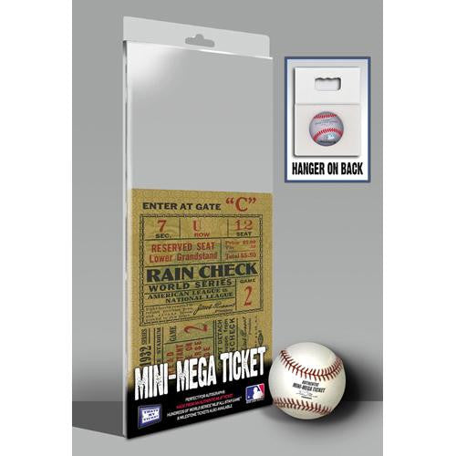 The 1932 World Series is best remembered for Babe Ruth's famous Called Shot. Whether Ruth pointed to the stands or to the dugout in Game 3 at Wrigley Field remains a point of debate amongst baseball historians. However what's not debatable from the 1932 World Series is the Yankees dominance in sweeping the Cubs. Led by Ruth playing in his 10th and final World Series as well as Lou Gehrig and Bill Dickey the Yankees scored 37 runs in the four games. The title marked the Yankees fourth World Series championship and first since 1928. This 1932 World Series Mini-Mega Ticket commemorates the occasion. Overall Size: 6 (W) x 8 1/2 (H) x 3/4 (D) Officially licensed by MLB Mini-Mega Tickets are made from authentic MLB tickets. Mini-Mega Tickets are approximately 200% larger than their original ticket size and printed directly on 1/4-inch thick rigid PVC board. They are perfect for autographs. Mini-Mega Tickets make great wall art as they include a flexible wall hanger on their back. *Product
