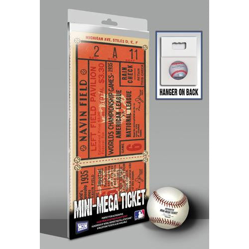 The 1935 World Series featured two teams the Detroit Tigers and Chicago Cubs that had recently experienced World Series hardship. The Cubs had lost the 1929 and 1932 World Series while the Tigers had lost the previous season. In fact Detroit had never won a World Series until 1935. Led by pitcher Tommy Bridges Charlie Gehringer and Mickey Cochrane the Tigers captured their first title in six games. This 1935 World Series Mini-Mega Ticket commemorates the occasion. Overall Size: 6 (W) x 14 (H) x 1/4 (D) Officially licensed by MLB Mini-Mega Tickets are made from authentic MLB tickets. Mini-Mega Tickets are approximately 200% larger than their original ticket size and printed directly on 1/4-inch thick rigid PVC board. They are perfect for autographs. Mini-Mega Tickets make great wall art as they include a flexible wall hanger on their back.