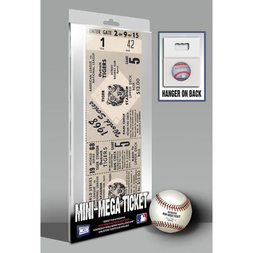 The 1968 Tigers hold a special place in the hearts of Detroit fans. Featuring a wave of popular players including Willie Horton Al Kaline Norm Cash and Bill Freehan as well as the talented arms of Denny McLain and Mickey Lolich the Tigers edged the defending champion St. Louis Cardinals in seven games. The victory gave the franchise its first title since 1945. Lolich won Games 25& 7 and was named MVP. This Game 5 Mini-Mega Ticket commemorates the occasion. Overall Size: 4 1/2 (W) x 14 (H) x 1/4 (D) Officially licensed by MLB Mini-Mega Tickets are made from authentic MLB tickets. Mini-Mega Tickets are approximately 200% larger than their original ticket size and printed directly on 1/4-inch thick rigid PVC board. They are perfect for autographs. Mini-Mega Tickets make great wall art as they include a flexible wall hanger on their back.
