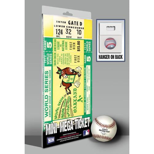 The 1972 Oakland A's were the first of three straight championship teams for owner Charlie Finley's Swing in A's. Led by Catfish Hunter Sal Bando Joe Rudi Rollie Fingers and MVP Gene Tenace the A's defeated the Cincinnati Reds in seven games. This Mini-Mega Ticket commemorates the title. Overall Size: 14 (W) x 5 7/8 (H) x 1/4 (D) Officially licensed by MLB Mini-Mega Tickets are made from authentic MLB tickets. Mini-Mega Tickets are approximately 200% larger than their original ticket size and printed directly on 1/4-inch thick rigid PVC board. They are perfect for autographs. Mini-Mega Tickets make great wall art as they include a flexible wall hanger on their back. *Product shown in packaging