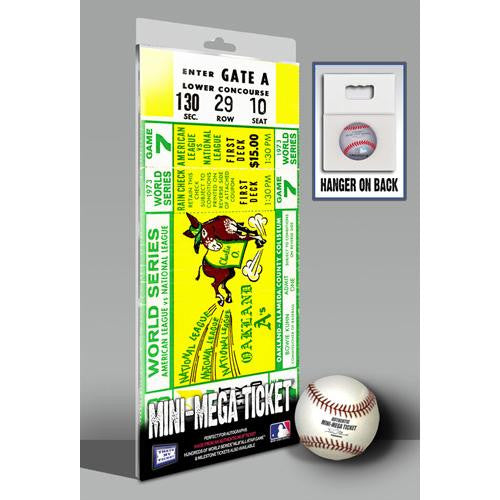 The 1973 Oakland A's hold a special place in baseball history. Owner Charlie Finley's mustachioed group defended its World Series title by defeating the New York Mets in seven games. Reggie Jackson who won the 1973 regular-season MVP was named World Series MVP. Hall-of-Famers Rollie Fingers and Catfish Hunter also contributed to the victory. This Game 7 Mini-Mega Ticket commemorates the title. Overall Size: 14 (W) x 5 7/8 (H) x 1/4 (D) Officially licensed by MLB Mini-Mega Tickets are made from authentic MLB tickets. Mini-Mega Tickets are approximately 200% larger than their original ticket size and printed directly on 1/4-inch thick rigid PVC board. They are perfect for autographs. Mini-Mega Tickets make great wall art as they include a flexible wall hanger on their back. *Product shown in packaging