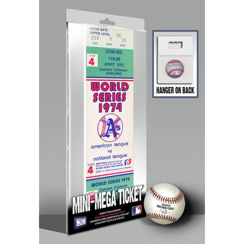 "The 1974 Oakland A's made it official, The team of Reggie Jackson Joe Rudi Catfish Hunter and Rollie Fingers was truly a baseball dynasty. The A's had won back-to-back World Series titles in 1972-73 and when they knocked off the Los Angeles Dodgers in the 1974 Fall Classic the three-peat secured their place in baseball history. This 1974 World Series Mini-Mega Ticket commemorates the title. Overall Size: 3 3/4 (W) x 14 (H) x 3/4 (D) Officially licensed by MLB Mini-Mega Tickets are made from authentic MLB tickets. Mini-Mega Tickets are approximately 200% larger than their original ticket size and printed directly on 1/4-inch thick rigid PVC board. They are perfect for autographs. Mini-Mega Tickets make great wall art as they include a flexible wall hanger on their back. *Product shown in packaging"