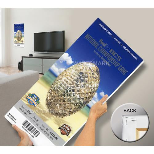 Officially licensed by the Collegiate Licensing Company Mega Tickets are cutting-edge wall art. They are created from authentic game tickets enlarged 500% printed on archival canvas and professionally stretch-mounted. Perfect for autographs. The National Championship Trophy and the image of the Crystal Football are trademarks of the American Football Coaches Association (AFCA). The AFCA is the copyright owner of the National Championship Trophy. e1986 AFCA Overall Size: 15(W) x32(H) x0.75(D).