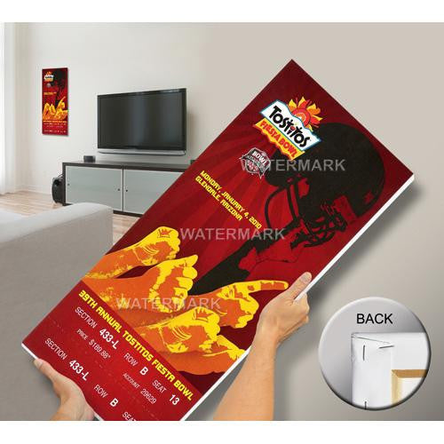 Officially licensed by the Collegiate Licensing Company Mega Tickets are cutting-edge wall art. They are created from authentic game tickets enlarged 500% printed on archival canvas and professionally stretch-mounted. Perfect for autographs. Overall Size: 14(W) x32(H) x0.75(D).