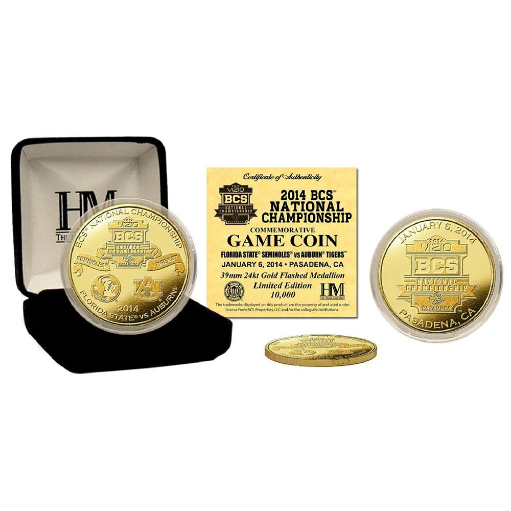 The 2014 BCS Championship Commemorative Game Coin measures 39mm and flash plated with Gold! Each Coin is minted with the dueling logos of Undefeated Florida State Seminoles and Auburn Tigers on the front and the Official 2014 BCS Championship Game Commemorative Logo is minted on the reverse. Each coin is individually numbered protected in a clear capsule to preserve its condition and delivered in a black velour jewelry Box along with a Certificate of Authenticity. Limited Edition of 10000 and Officially Licensed by CLC. Proudly made in the USA by The Highland Mint!