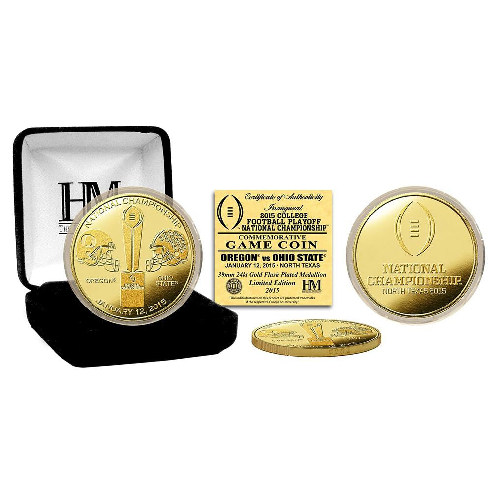 Minted to commemorate the Inaugural College Football Championship Playoff Game. The game coin measures 39mm in diameter and its flash plated with gold. The front of the coin is minted with the dueling helmets of the CFP National Championship final teams and ereverse of the coin is minted with the 2015 CFP National Championship emblem. The coin is protected in a clear capsule to preserve its condition and delivered in a black velour jewelry case. Each coin is individually numbered on its edge and each is accompanied by a certificate of authenticity. This coin is a Limited Edition of only 2015 and officially licensed. Proudly made in the USA by the Highland Mint.