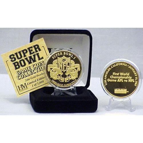 The Highland Mint presents the 24kt Gold Super Bowl I flip coin. THESE UNIQUE GAME COINS COMMEMORATE EACH INDIVIDUAL SUPER BOWL PLAYED! THE COIN IS INDIVIDUALLY NUMBERED AND FEATURES THE SUPER BOWL LOGO FOR THAT YEAR AS WELL AS THE LOCATION AND DATE OF THE GAME. Each Minted coin is triple struck to feature the finest detail. Made of 24kt Gold overlay the coin combines a beautiful mirrored and frosted finish. Each coin measures 1.5in diameter presented in a capsule to preserve its Mint condition. It is then displayed in a black velour jewelry box includes a Certificate of Authenticity. Is limited to 5000 for each year and is officially licensed by the NFL.