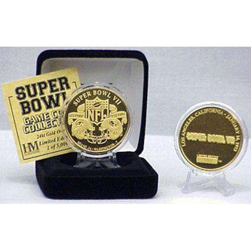 The Highland Mint presents the 24kt Gold Super Bowl VII flip coin. THESE UNIQUE GAME COINS COMMEMORATE EACH INDIVIDUAL SUPER BOWL PLAYED! THE COIN IS INDIVIDUALLY NUMBERED AND FEATURES THE SUPER BOWL LOGO FOR THAT YEAR AS WELL AS THE LOCATION AND DATE OF THE GAME. Each Minted coin is triple struck to feature the finest detail. Made of 24kt Gold overlay the coin combines a beautiful mirrored and frosted finish. Each coin measures 1.5in diameter presented in a capsule to preserve its Mint condition. It is then displayed in a black velour jewelry box includes a Certificate of Authenticity. Is limited to 5000 for each year and is officially licensed by the NFL.