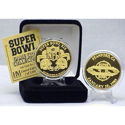 The Highland Mint presents the 24kt Gold Super Bowl XIX flip coin. THESE UNIQUE GAME COINS COMMEMORATE EACH INDIVIDUAL SUPER BOWL PLAYED! THE COIN IS INDIVIDUALLY NUMBERED AND FEATURES THE SUPER BOWL LOGO FOR THAT YEAR AS WELL AS THE LOCATION AND DATE OF THE GAME. Each Minted coin is triple struck to feature the finest detail. Made of 24kt Gold overlay the coin combines a beautiful mirrored and frosted finish. Each coin measures 1.5in diameter presented in a capsule to preserve its Mint condition. It is then displayed in a black velour jewelry box includes a Certificate of Authenticity. Is limited to 5000 for each year and is officially licensed by the NFL.