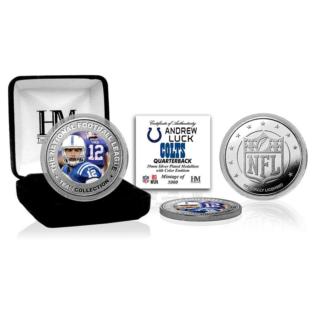 Limited edition! Andrew Luck's color image is embedded in the center of this 39mm minted commemorative coin. Each silver plated coin is protected in a clear capsule to preserve its condition and delivered in a black velour jewelry display box. A limited edition of only 5000 each mint coin is individually struck with a serial number on its edge and accompanied by a certificate of authenticity. It is officially licensed by the NFL and NFLPA and proudly made in the USA by The Highland Mint.