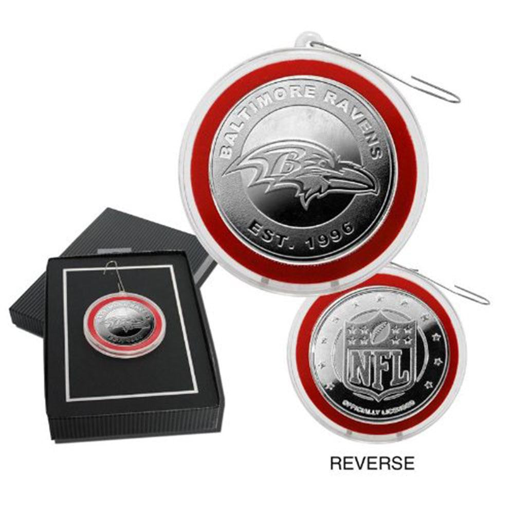 An NFL Commemorative Coin minted with your team logo on the front is protected in an ornament capsule and delivered ready to hang. Each coin measures 39mm in diameter and is struck in precious Fine Silver plate over solid bronze and delivered in a custom 4?x 5? gift box. Each coin is accompanied by a Certificate of Authenticity and Officially Licensed by NFL.