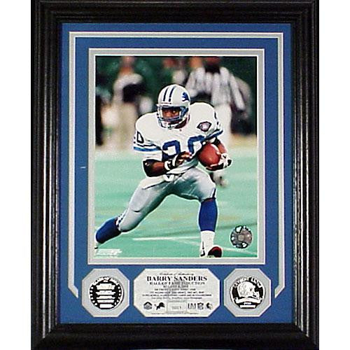 The Highland Mint presents the Barry Sanders Hall Of Fame Induction Photomint. Sanders one of the NFLs most electrifying runners was the first player ever to rush for 1000 yards in each of his first 10 seasons. Named first or second-team All-NFL in each of his 10 years with the Detroit Lions he rushed for 15269 yards and scored 99 touchdowns during his career. Each Hall of Fame Photo Mint features TWO SILVER overlay coins. One coin features the players respective team logo and the second coin features the names of the 2004 Inductees with their respective teams and years they played. Between both Coins is a numbered Certificate of Authenticity that lists their Hall of Fame Induction Date and Career accomplishments. Each is presented in a 13 x 16 black molded wood frame and mounted team colored laser cut double matting with a Glass front panel. This is a limited edition of 2004 and is officially licensed by the NFL and NFL HOF.