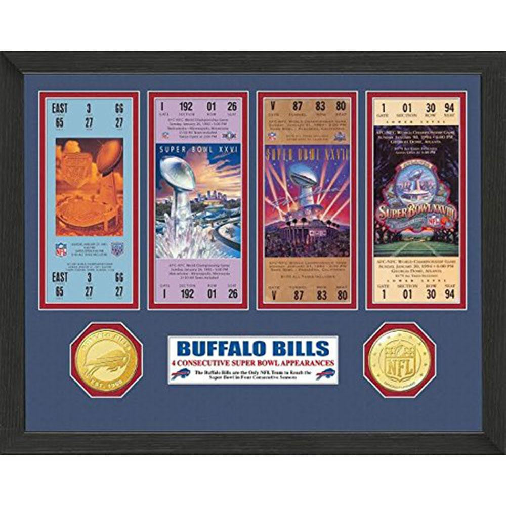 The Highland Mint commemorates the Buffalo Bills on their NFL record 4 consecutive Super Bowl appearances! Featured in a 12? x 12? wood frame withedouble matting are 4 replica tickets from each Super Bowl along with a minted bronzeeBuffalo Bills team commemorative coin and aeminted bronze NFL coin. Each piece iseaccompanied by aecertificate of authenticity. It is officially licensed by the NFL and proudly made in the USA by The Highland Mint!