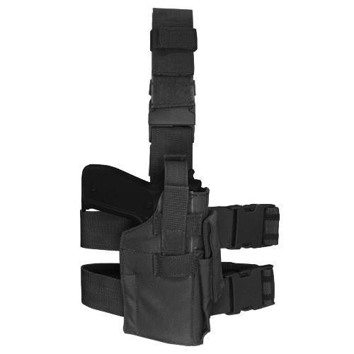"This Tactical Leg Holster by Condor features a fully adjustable retention system with additional velcro strap to secure weapon. Fully adjustable leg strap with non-slip rubber lining and quick release buckle. One magazine pouch, with adjustable velcro strap. Will fit Medium or Large size pistol."
