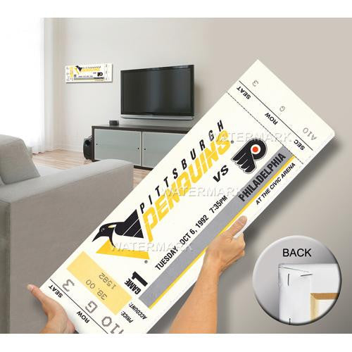 Officially licensed by the NHL Mega Tickets are cutting-edge wall art. They are created from authentic game tickets enlarged 500% printed on archival canvas and professionally stretch-mounted. Perfect for autographs. NHL and the NHL Shield are registered trademarks of the National Hockey League. All NHL logos and marks and NHL team logos and marks depicted herein are the property of the NHL and the respective teams and may not be reproduced without the prior written consent of NHL EnterprisesL.P. e NHL 2011.All Rights Reserved. Overall Size: 11(W) x33(H) x0.75(D).