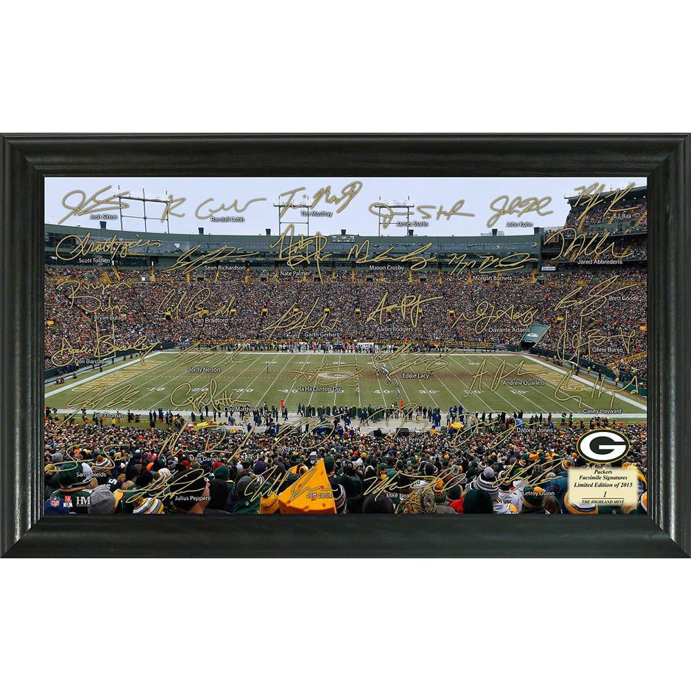 Featured in a 12? x 20? wood frame are the facsimile (exact replica) signatures of your favorite NFL team's players spread out on a glossy image of their home field and each is individually numbered. Protected under glass this item is a limited edition of only 2015 and officially licensed by the NFL and NFLPA. Proudly made in the USA by The Highland Mint!