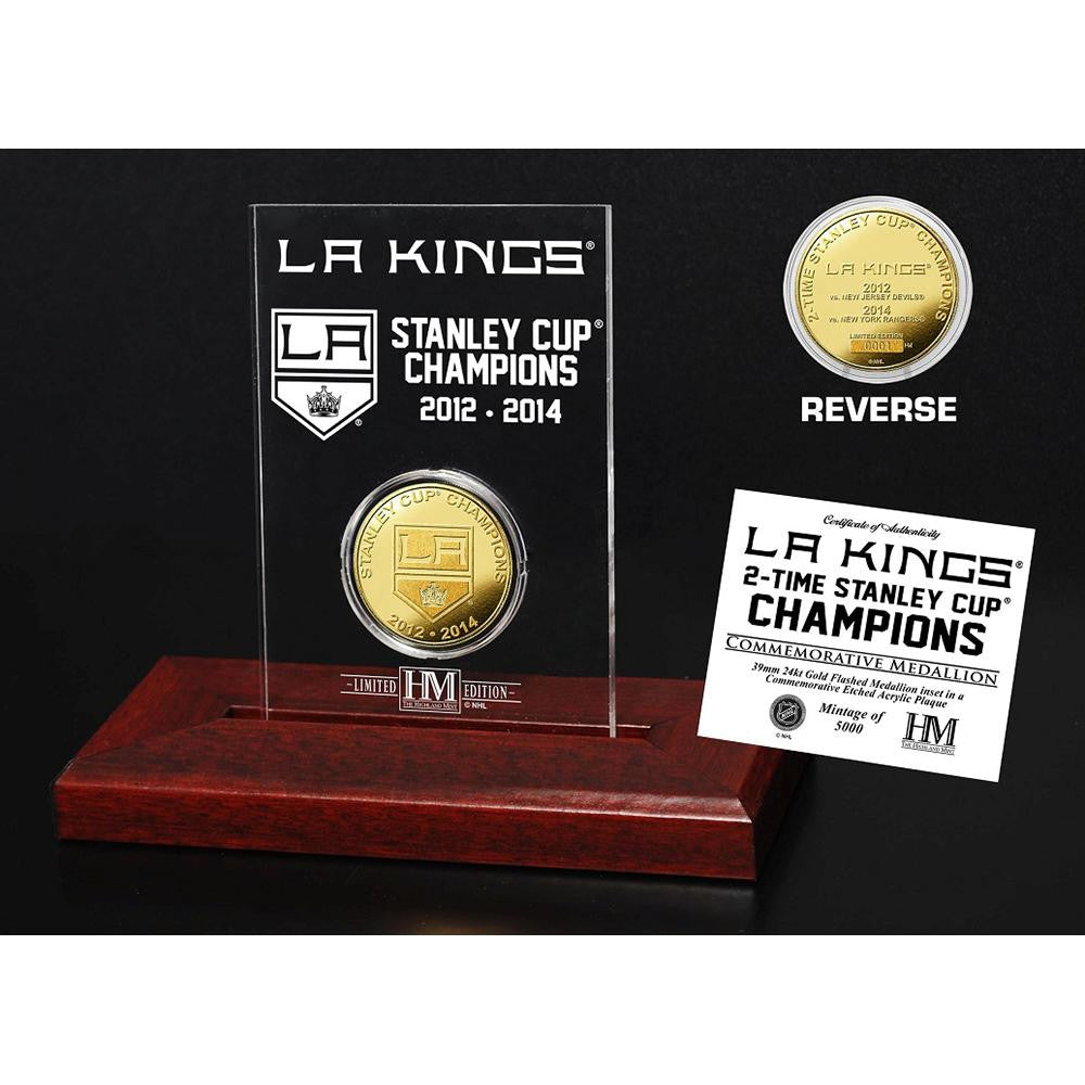 A 39mm minted and flashed in gold LA Kings 2-time Stanley Cup Champions coin is featured in a 3.5in x 5in Engraved Acrylic commemorating each of the Stanley Cups and displayed on a wood stand with a custom nameplate. Limited Edition of 5000 and officially Licensed by NHL. Proudly made in the U.S.A. by The Highland Mint.