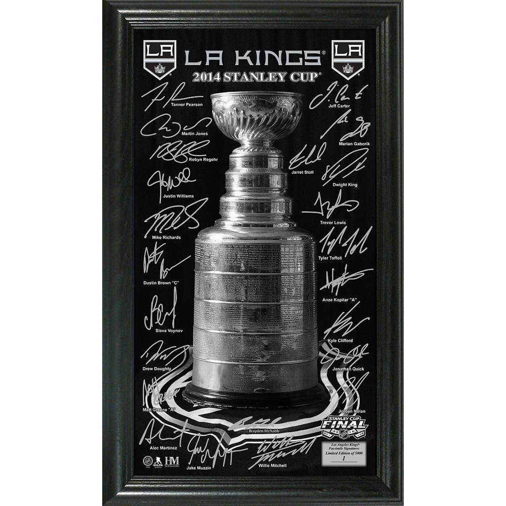 The coveted Stanley Cup is featured on a 10? x 18? glossy photo with the facsimile (replica) signatures of the LA Kings roster and delivered in a 12in x 20in Frame with a Glass front panel! A limited edition of only 5000 each photo is individually numbered and a certificate of authenticity is pasted on the back of each frame. Officially licensed by the NHL and NHLPA and proudly Made in the USA by the Highland Mint.