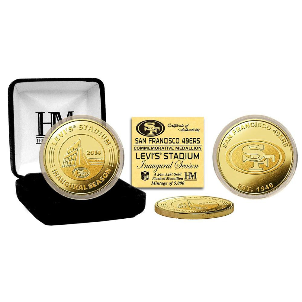 Coins are minted to mark important moments in time! The Levi?s Stadium Inaugural Season Coin is minted with the official Inaugural logo on the front and the 49ers logo on the back. Limited Edition of 5000. Each coin measures 39mm in diameter and each is carefully flash plated with gold. eThe inaugural Season gold coin is protected in an airtight capsule to preserve its condition and delivered in a 2.5in x 2.5in black velour jewelry box. Officially licensed by the NFL a certificate of authenticity accompanies each coin. Proudly made in the USA by The Highland Mint