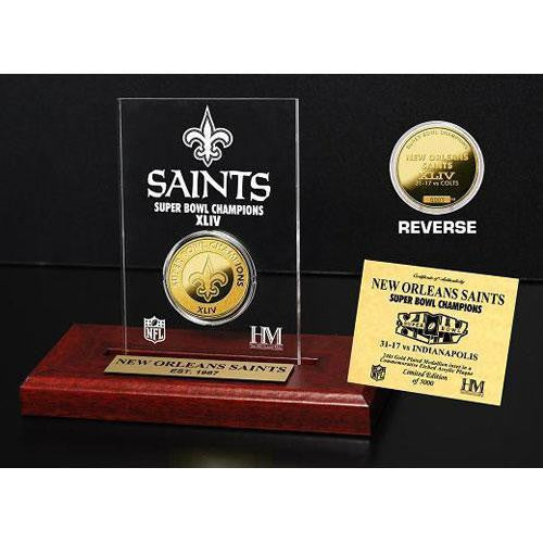 Limited Edition of 5000! A 24KT Gold plated New Orleans Saints Super Bowl Champs Coin is beautifully displayed in a 3.5in x 5in Acrylic with custom Team Logo Archival Etching (Engraving). Each is delivered with a cherry wood base with an engraved nameplate as well as a Certificate of Authenticity. A Limited Edition of 5000 and Officially Licensed by the NFL.