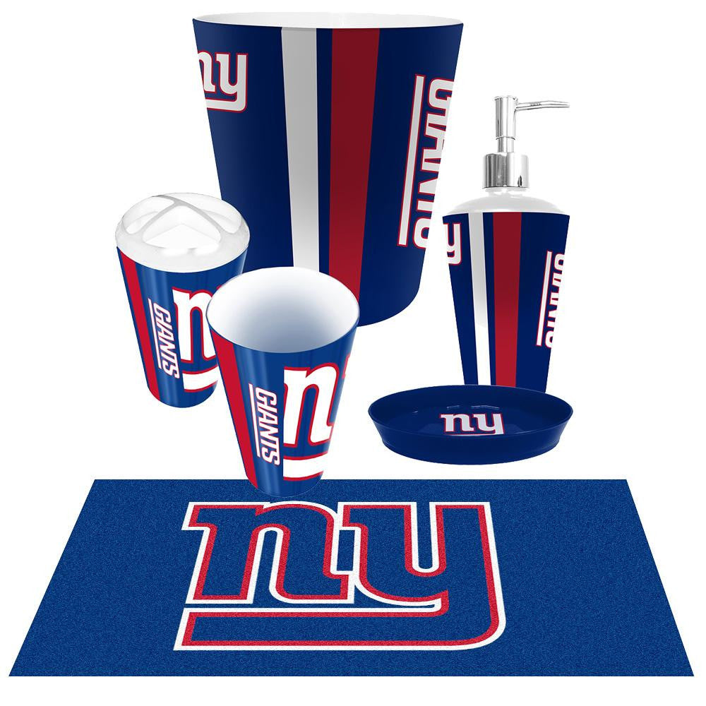 Show off your team spirit with our 6 Piece Bathroom Set. The ultimate bathroom collection for the true die hard fan. The bathroom rug is machine washable with Serged edges and a non-slip latex backing. The rest of the pieces are made with high quality polymer and has bright vibrant colors. The set contains: Toothbrush Holder, Soap Dish, Soap Dispenser, Wastebasket, a Tumbler, and a Bathroom Rug. Officially Licensed. Bathroom rug measures 19in x 30in and is made of nylon with a non-slip latex backing. Wastebasket is 10in tall.