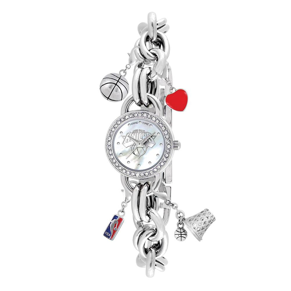 "Designed specifically for the lady fan, the Women's Charm Watch by Game Time is definitely full of appeal. The silver tone team logo looks beautiful on the pearl dial, while the league charm adds to its unique look. Made with a durable stainless steel band and scratch resistant lens, this watch is perfect for game day or everyday wear! Features: Officially licensed team logo. Silver tone inlay and team logo on dial. Stainless steel band. Precision quartz movement. Mother of pearl dial. Applied crystal indexes. Scratch resistant mineral crystal lens. Stainless steel caseback. Water/shock resistant to 3 ATM. Limited lifetime warranty. Specifications: Case color: Silver. Case size: 35mm. Case width: 6mm. Lug size: 16mm. Length: 7 3/4. Case material: Alloy. Case plating: PNP. Movement: 2037 (Citizen) Strap material: Stainless steel. Strap color: Silver bracelet. Battery: Japan battery. Weight: 0.20 lbs."