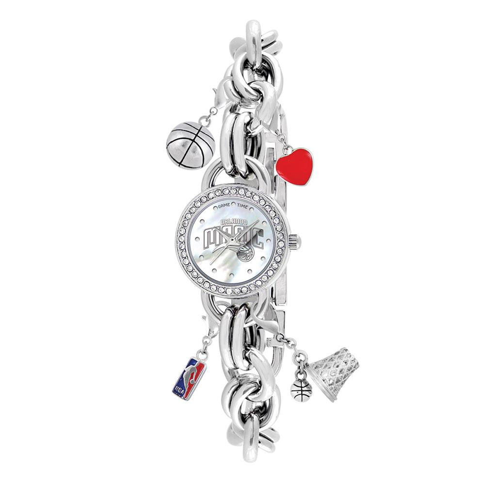 "Designed specifically for the lady fan, the Women's Charm Watch by Game Time is definitely full of appeal. The silver tone team logo looks beautiful on the pearl dial, while the league charm adds to its unique look. Made with a durable stainless steel band and scratch resistant lens, this watch is perfect for game day or everyday wear! Features: Officially licensed team logo. Silver tone inlay and team logo on dial. Stainless steel band. Precision quartz movement. Mother of pearl dial. Applied crystal indexes. Scratch resistant mineral crystal lens. Stainless steel caseback. Water/shock resistant to 3 ATM. Limited lifetime warranty. Specifications: Case color: Silver. Case size: 35mm. Case width: 6mm. Lug size: 16mm. Length: 7 3/4. Case material: Alloy. Case plating: PNP. Movement: 2037 (Citizen) Strap material: Stainless steel. Strap color: Silver bracelet. Battery: Japan battery. Weight: 0.20 lbs."