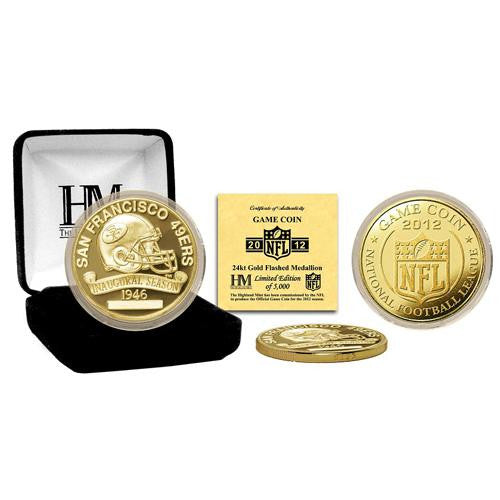 The game does not start with out this coin! The Highland Mint presents the 2012 NFL Game Coins minted in 24KT Gold flash and delivered in a 2.5in x 2.5in black velour jewelry box as well as an individually numbered Certificate of Authenticity. Each 24KT Gold flashed coin is a Limited Edition of 5000. Officially Licensed by the NFL. Proudly made in the USA by The Highland Mint!