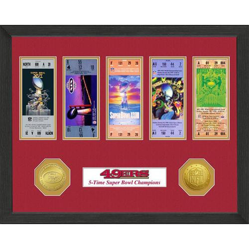 San Francisco 49erseSuper Bowl replica Tickets from each Championship are featured in a 12in x 15in wood Frame withedouble mattingewith a solid BronzeeSuper Bowle5 Time Champions Commemorative Coin and aesolid Bronze NFL Coin.eEacheframe is accompanied by aeCertificate of Authenticity. Officially Licensed by the NFL.eProudly made in the U.S.A!
