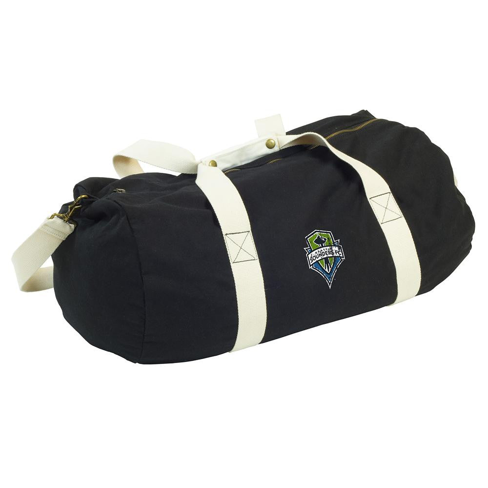 Screenprinted team logo. Black fabric with distressed logo and retro styling. Dual handles and removable shoulder strap. Dimensions: 22 x 9 x 12. Cotton material. Case packs of 6.