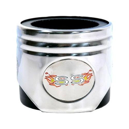 "Each Piston Can Cooler is made from gleaming stainless steel and is a piston shaped drink can cooler. Featuring baked-on enamel art and cleverly designed to make drinking more convenient, reduce weight, yet still keep the can cold."