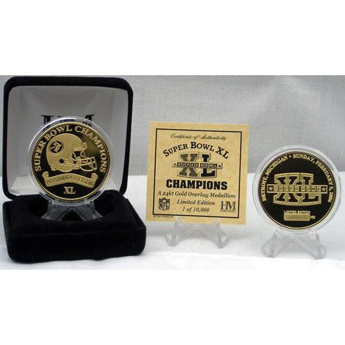 The Highland Mint Commemorates the Super Bowl XL Champions with a minted 24KT Gold Coin! Historically coins mark moments in time they mark a moment forever because a coin lasts forever! Commemorating the Super Bowl Champs and most of all the XL champs is more than appropriate. The Highland Mint is the exclusively authorized by the NFL to mint the Super Bowl Champions coin. Each coin measures 1.5 in diameter and the coins are meticulously triple struck to the highest standards in minting tradition. The front of the coin features the Champs team helmet with the commemoration listed on the perimeter. The back of each coin features the Super Bowl XL Logo and number pad where each coin is individually serialized. Each is protected in a hard plastic capsule TO PRESERVE its MINT CONDITION and displayed in a custom velour jewelry box for safekeeping or to display. Furthermore a certificate of authenticity accompanies each. These medallions are officially licensed and limited to only 5000 p