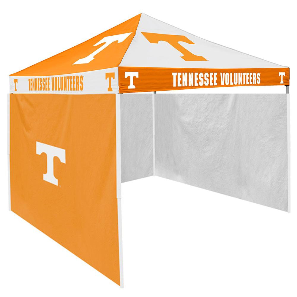 Be ready for NCAA tailgate parties and your next picnic and bbq with this NCAA canopy and side wall. The large 9?x9? tents have a durable water resistant canopy made of polyester with school logos on all four sides. 6 ft. height clearance and stands 9ft tall at tallest point. Tents retract to 4 ft. for easy moving and storage. Includes ground stakes for extra stability. Features alternating color canopies and valances. The NCAA side wall is perfect for privacy or weather protection and has a large screen printed logo. The side walls attach easily with Velcro straps to the canopy frame.