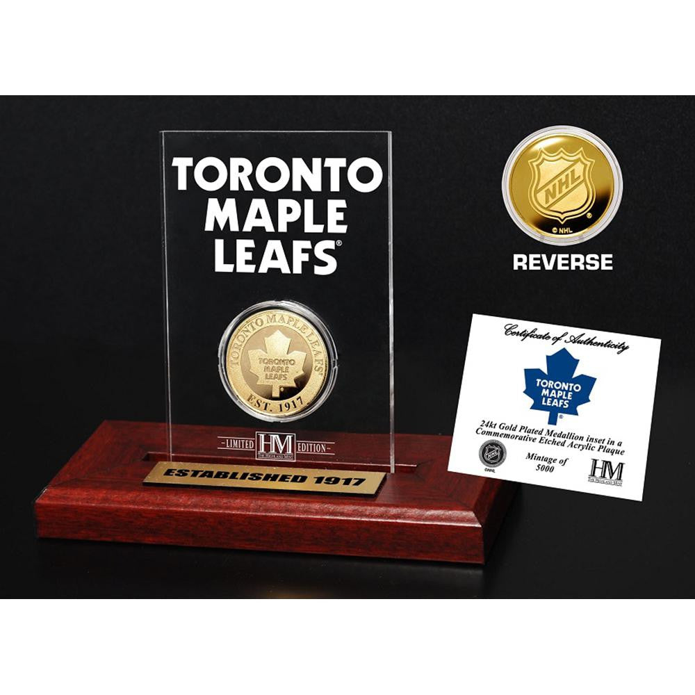 Limited Edition ofe5000!e The Goldeflashed Team CommemorativeeCoin is featured in a 3.5in x 5in acrylic engraved with theeNHL Shield Logo on the reverse of the coin. The individually numbered 39mm Minted Goldeflashed Coin and engraved acrylic is delivered with a wood base that includes an engraved nameplate as well each is accompanied by a Certificate of Authenticity. Officially Licensed by the NHL.