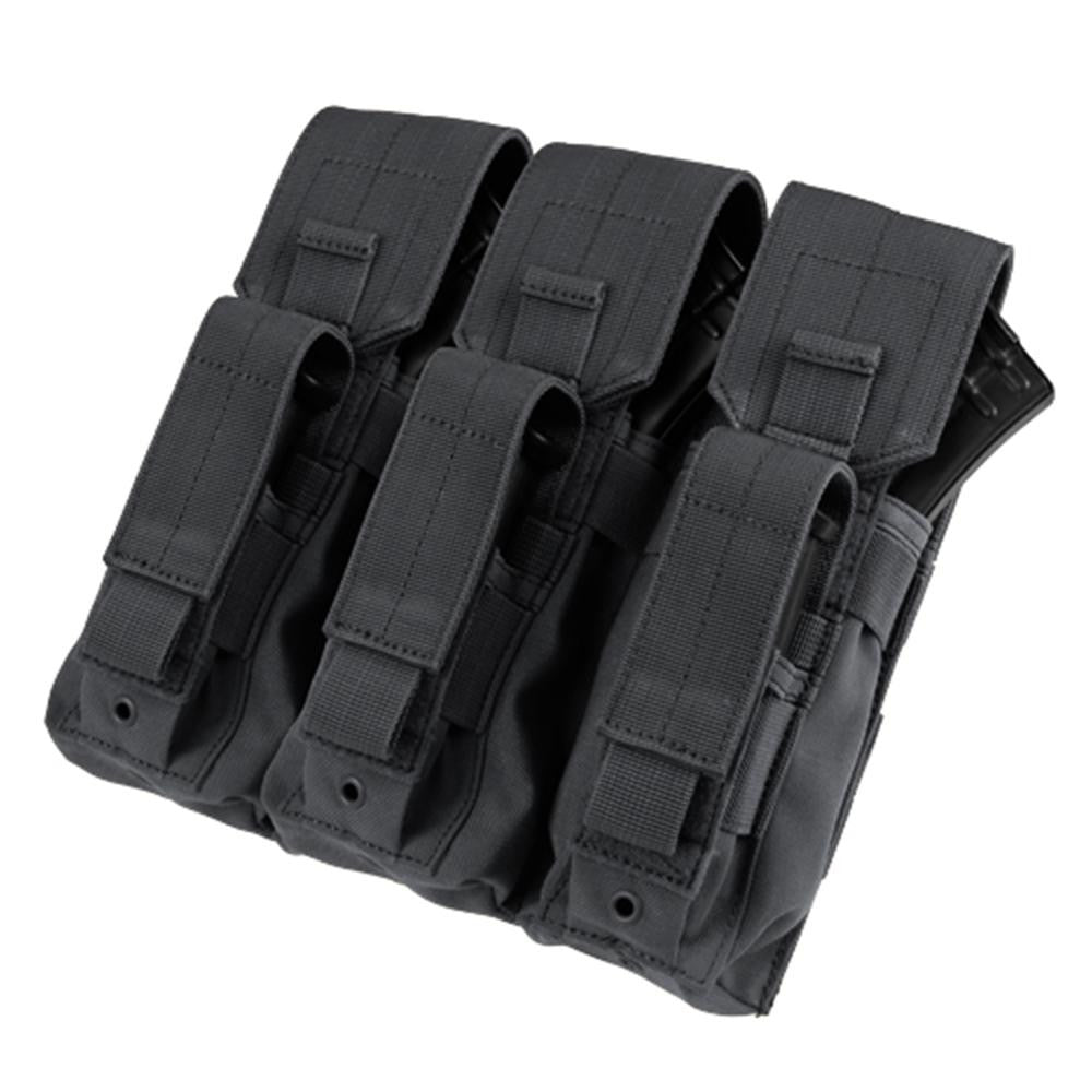 "Three AK mag pouches with adjustable Hook & Loop flaps. Three pistol mag pouch in the front with adjustable Hook & Loop flap. MOLLE compatible, two 6 mod strap is included."
