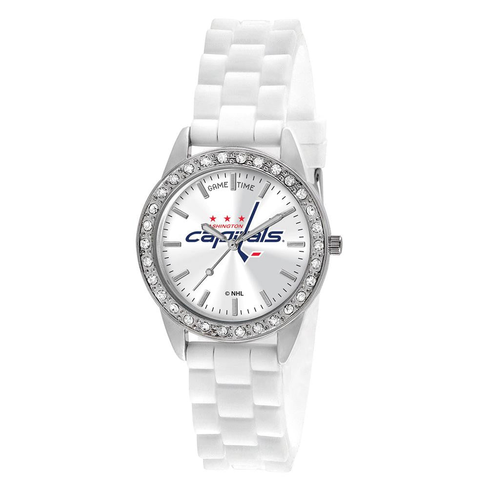 Hopefully your team's hotter than this frosty watch from Game Time! The Women's Frost Watch feature's an official team logo. Your team's color logo will stand out beautifully surrounded by the silver tone case and white silicone band. This is a must have for the female fan that's passionate about her sports team! Features: Stainless steel caseback. Silicone strap. Japan quartz movement. Sunray dial. Case size: 38mm. Water resistant to 3 ATM (99 ft.). Limited lifetime warranty. Officially licensed.