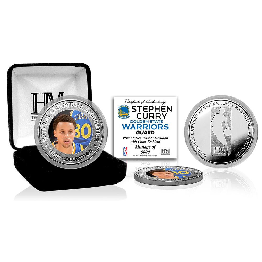 "Limited edition! Stephen Curry's color image is embedded in the center of this 39mm minted commemorative coin. Each silver plated coin is protected in a clear capsule to preserve its condition and delivered in a black velour jewelry display box. A limited edition of only 5000, each mint coin is individually struck with a serial number on its edge and accompanied by a certificate of authenticity. It is officially licensed by the NBA and proudly made in the USA by The Highland Mint."
